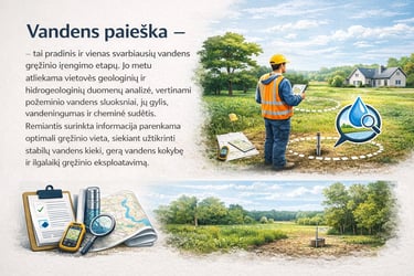 Vandens paieška – tai pradinis ir vienas svarbiausių vandens gręžinio įrengimo etapų. Jo metu atliekama vietovės geologinių ir hidrogeologinių duomenų analizė, vertinami požeminio vandens sluoksniai, jų gylis, vandeningumas ir cheminė sudėtis. Remiantis surinkta informacija parenkama optimali gręžinio vieta, siekiant užtikrinti stabilų vandens kiekį, gerą vandens kokybę ir ilgalaikį gręžinio eksploatavimą.